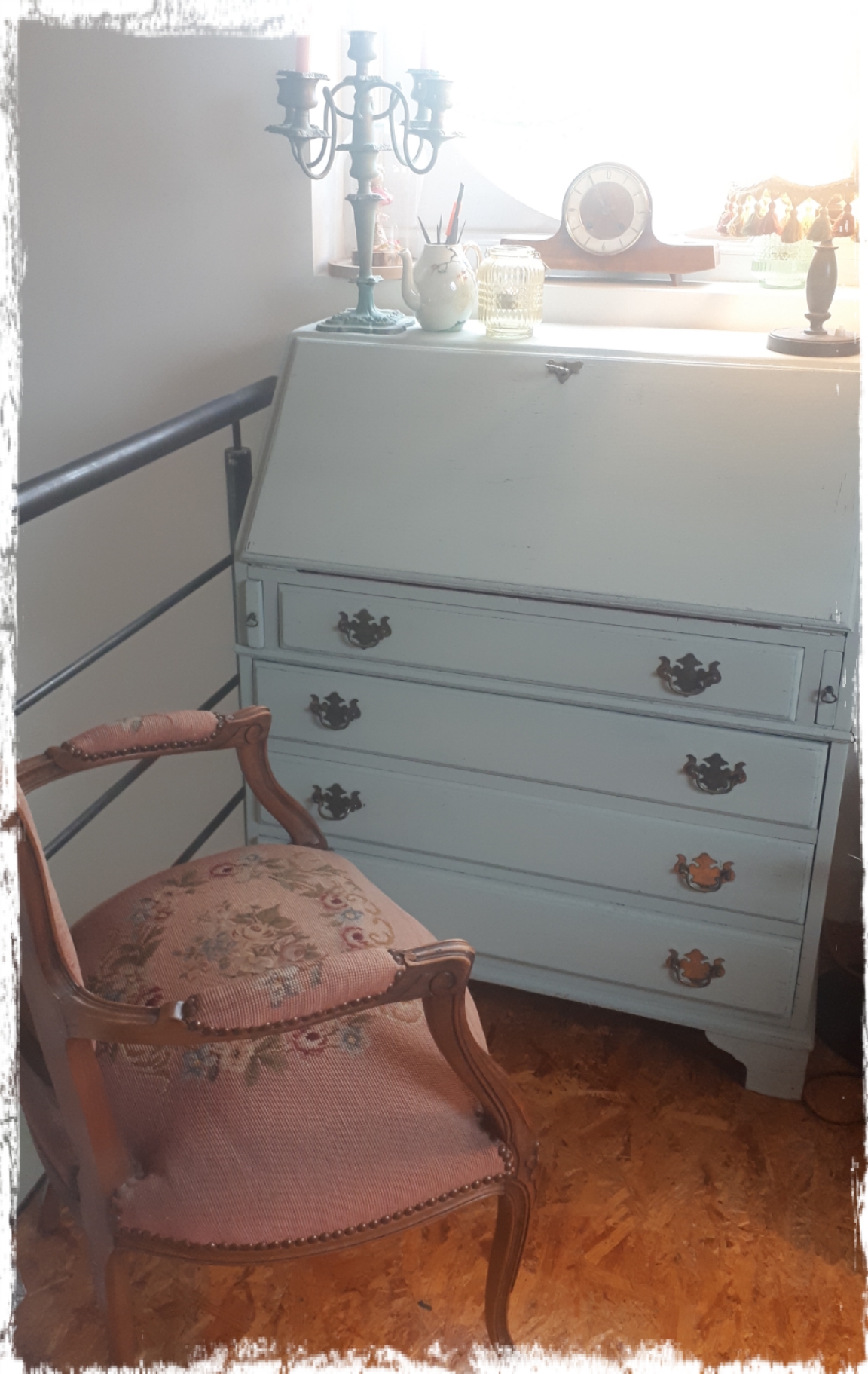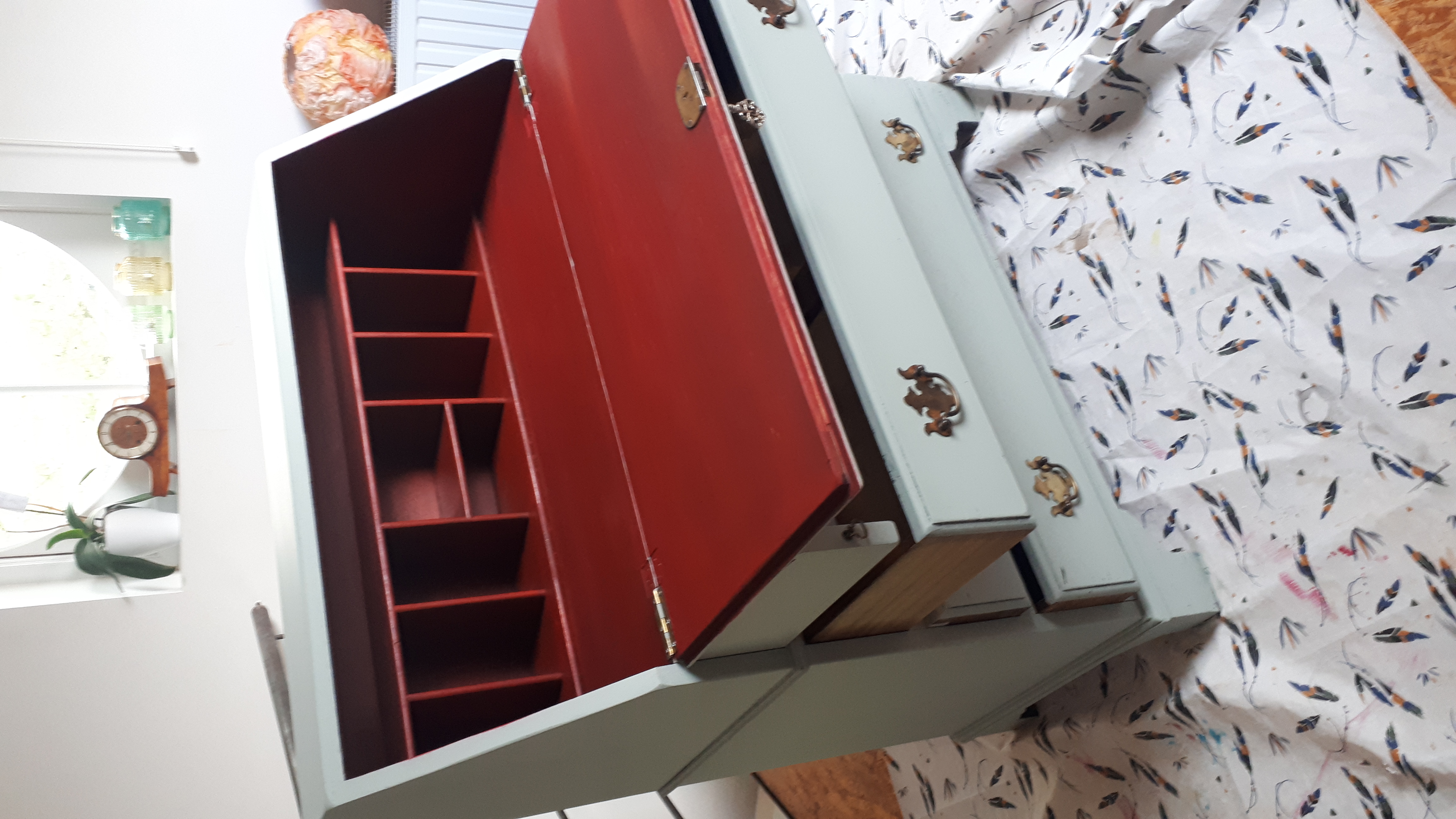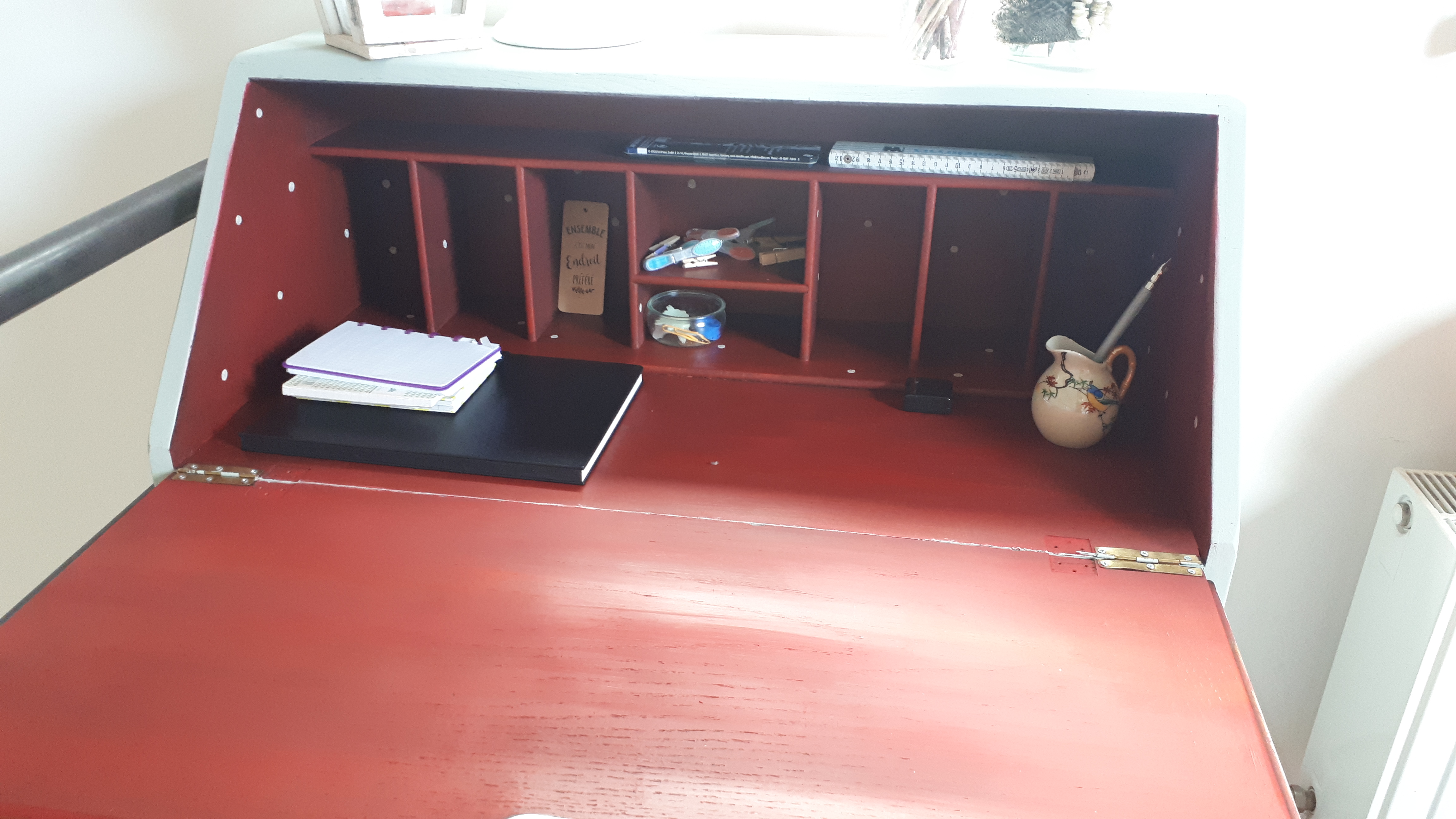 Ainsi, j’ai repeint un vieux secrétaire, qui me sert pour rédiger mes articles (j’y suis bien installée en ce moment-même), pour dessiner, ainsi que pour les devoirs de ma plus jeune fille, qui en est tombée amoureuse!